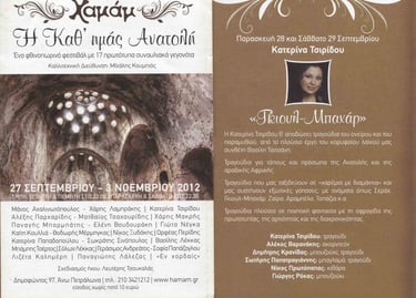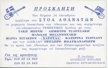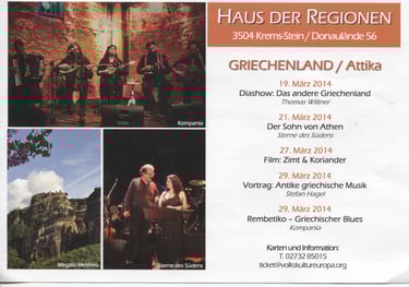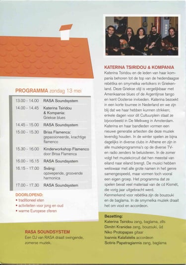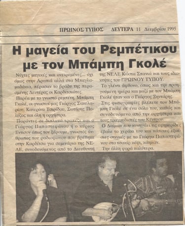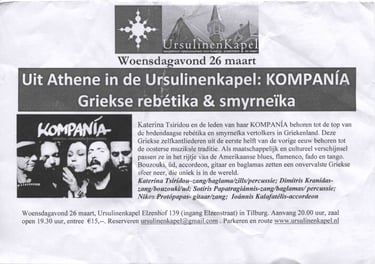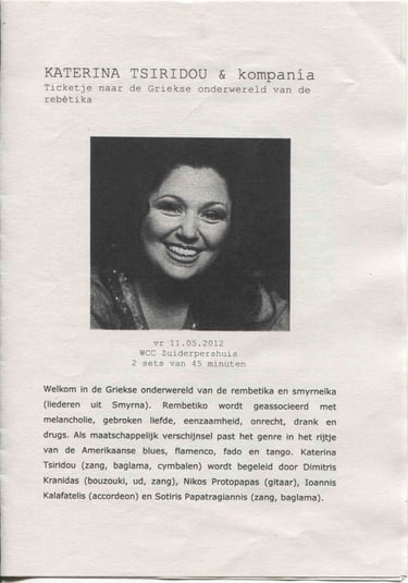 “One word could be enough to describe their performance: ‘magical’!!” “ The group’s name may sound unassuming (KOMPANÍA means ‘band’) but in terms of music we are on a completely different level. One word could be enough to describe their performance: “magical”. Of course they played material from their recent “KOMPANÍA Live!”CD, but there were also other, often classic rebétiko songs on the repertoire. Not only the musical level was very high, they also touched the audience visually; the interesting start of their set, with one musician on the stage playing and the others joining one by one, a song with three baglamades which felt very special and intimate. As the concert evolved, it grew in depth, atmosphere and of course audience involvement. Many of those present, including myself will remember this concert for a long time.”……… By Bobtje Blues 12-11-2012 www.bobtjeblues.com