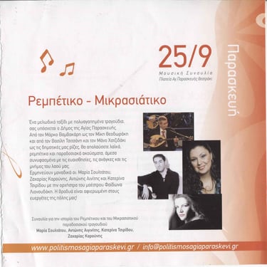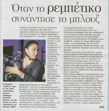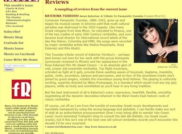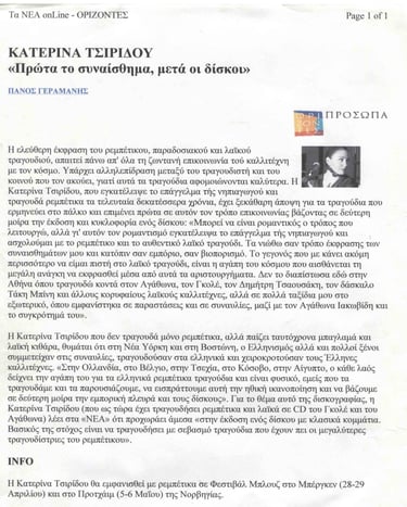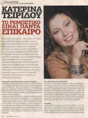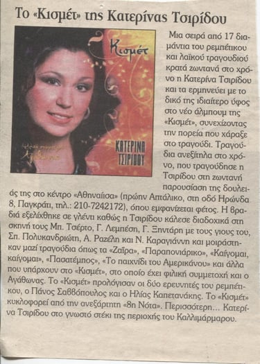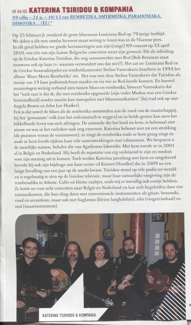 “A five star cd review from "Concerto" magazine – Austria” “Singer Katerina Tsirídou studied classical piano, guitar and baglamas. At an early age she played with well known musicians from the Greek folk scene like Stelios Vamvakaris, Takis Binis and Babis Tsertos. But she also has connected with Louisiana Red and Jolly Jumper and merged blues with rembetika. On this cd you can hear live recordings with the group KOMPANÍA which consists of four more musicians. With baglama, ûd, accordion, bouzouki, guitar and percussion the music moves through the highs and lows of life. So much expression, so wild, so archaic, so existential, this is music from Greece without holiday romanticism. KOMPANÍA certainly stands for a honest, authentic, unpolished interpretation of the rembetika repertoire. (Rated *****)” By leiss, Concerto, 02-04-2013 www.concerto.at