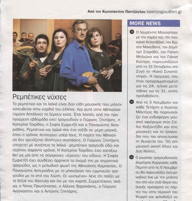 "KOMPANÍA": The rembetika band, that spreads our folk music throughout Europe. Katerina, Sotiris, Dimitris and the other guys, give their "answer" through their melodic culture. KOMPANÍA means folk music band. It is, since the 19th century, a "hive" of original music culture, all over the Balkan region. This is the name, that a company of friends chose to give to their band, touring Europe! They are all significant performers of the traditional rembetika songs: Katerina Tsiridou: Vocals, Baglama, Zills - Sotiris Papatragiannis: Vocals, Baglama - Dimitris Kranidas: Vocals, Bouzouki, Oud - Nikos Protopapas: Guitar and Giannis Kalafatelis: Accordeon. So, because people outside Greece tend to appreciate tradition and beauty, far more than the natives, who usually settle with non worthy, cheap-pop, by-products, the Dutch, without any delay, recorded the successful "KOMPANÍA" concert and they released a cd, featuring 15 iconic rembetika songs! We asked them for a few words, about their admittedly beautiful work: -Do the non-Greeks still appreciate the rembetika? Some years ago, the rembetika songs, were more popular outside Greece, than nowadays! Nevertheless, so far, in every place that we played the theaters were full and more importantly, the love and the respect that we met, were unprecedented. It's a sad fact, that outside Greece, people respect the rembetika and the Greek tradition, far more than many Greeks. -In your opinion, what is it that attracts the non Greeks and what do they understand in rembetika? Even the people that don't speak Greek in order to understand the lyrics, they totally understand the spirit and the feeling of the songs, through the music and the renditions. Let's not forget that music is an international language, and especially folk and traditional music has no expiration date!!! -Can the artists change the bad reputation Greece has for many people around the world these days? Those who are really responsible for the present situation in Greece and around the world, make a big effort to pass on to the people, far more blame than what they deserve. So, it's not that easy to change people's way of thinking about Greece. It's a political issue and we don't have the means to change attitudes. Still I hope, that we give food for thought to some people, to think that besides money and numbers, people all over the world, produce some things far more important... They produce art, culture and ethics and these ideals are priceless! -And what about the Greeks outside Greece? These Greeks, of course, really need to keep in contact with their homeland and its tradition! It was unbelievable for us, when we first realized that some people did a three or four hours drive, just to come and attend our concert and then travel all their way back to their home, during the night! But in the end of every show, when they come to say hello to us, you can actually see in their faces, all the strength they have absorbed from the art and that's the most important and heart warming earning of this journey... By Ilias Voliotis - Kapetanakis, author/journalist 06-01-2013 www.mousapolytropos.gr