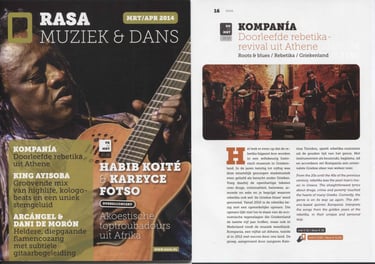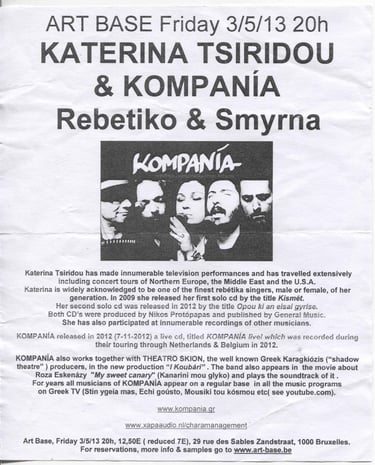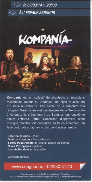 "CD review by the Belgian "ROOTSTIME" and Dani Heyvaert, for our album "Round Trip / Μετ' επιστροφής" "I admit, I was unfamiliar with this young Greek gang’s live debut album and so this second release, recorded in a studio situation was a first taste. Let me start out with the conclusion that this acquaintance was a very agreeable one indeed. In former days the group went by the name “Katerina Tsiridou & Kompania” and I happen to have cd material of that lady around, so the music was not completely new to me; all the more because over the years I developed quite a weak spot for anything that has to do with rebétiko, the Greek blues. On the cd cover they mention that they also play so called Smyrneïka music. Now I don’t remember much Greek but Smyrna appears to me to be the Greek name for what we know as Izmir these days (and) so Smyrneïka is the music of the Greek exiles, a cabaretesque genre that was brought to us, amongst others, by the great Rosa Eskenazi. The same Roza Eskenazi who happens to be the composer of the opening song of this record. “Arapina Mou Skertsoza”, a love song for a girl with beautiful black eyes whose whims the narrator would gladly submit to forever. So love. And passion…two universal and favorite topics in music. Kostas Skarvelis is the second big shot KOMPANÍA is borrowing from: his ”Erinaki” is about an unrequited love of a man for a woman who doesn’t even look at him. That, dear reader, we call The Blues. Vasilis Tsitsanis’”Ta Xena Cheria” gets a treatment, a song about an orphan’s fate to end up in ‘he hands of strangers’. “Ta Mandala” is also by Tsitsanis. In other words, the members of KOMPANÍA have respect for their great ancestors and are part of the tradition that was built by these people. This is also noticeable by renditions of songs by bouzouki master Apostolos Chatzichristos or the well-known “O Pinóklis” which was borrowed from Dimosthenis Zattas. I could run through every song but I’m afraid it won’t do you much good. I can do you a much better service by recommending to listen to this record at least one time. You will hear a bunch of very gifted musicians and singers who try, in a fitting way, to breathe new life into the songs they inherited from their forefathers. I have not heard the band live yet, but I imagine that a KOMPANÍA concert can be quite an experience. Highly recommended for everyone who wants to get further acquainted with the music of the Greek worker." By Dani Heyvaert, Rootstime, December 2013 www.rootstime.be