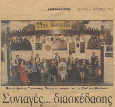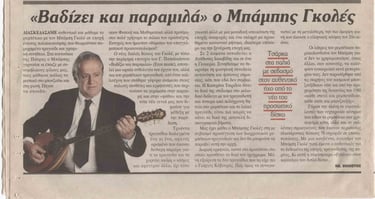 “KOMPANÍA – Live! CD Review by the German “Folker” magazine” “The songs of the Greek subculture in Athens – rembetika- and those from the oriental café’s of Smyrna/Izmir – smyrneïka - are presented by the Athens quintet in a most impressive manner. Excellent lead and harmony vocals as well as great performances on lute type instruments such as the baglamas, bouzouki and ûd and also on accordion are merged into an extremely intensive atmosphere with high level playing.” By Folker magazine, 03-04-2013 www.folker.de