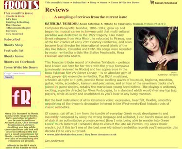 "Review by the british music magazine fROOTS - Issue April 2013" …KOMPANÍA’s Rebétika – Smyrneïka From Athens brings me back to the koutouki atmosphere, an underground, cramped den with rembetika music, meze, retsina and great company… …But back to the band – that’s what KOMPANÍA means – and the characteristic depth of Katerina Tsiridou’s voice who, together with the two lead singers Dimitris Kranidas and Sotiris Papatragiannis and musicians Yiannis Kalafatelis and Nikos Protopapas, creates a truly vintage style rembetika album. Of course the reason the album has this quality not only in sound but in music as well is because all five musicians on board follow the same direction and they are simply brilliant at what they do. Their musicianship, harmony and synchronization are flawless and cool, as KOMPANÍA sticks to the traditional and original version of these songs… …This album is a lovely introduction to some of the best known rembetika songs like Garsóna about the best waitress in the world who waters down the wine to earn a few extra quid; Misirlou and Of Amán about drinking and thus getting drunk, and Hatzí Baxés with references to the sweet doll from Thessaloniki, the baglama and Tsitsanis himself. Another point of trivia is that Katerina Tsiridou plays the baglama, check her out on youtube clips! By Elisavet Sotiriadou, fROOTS, 01-04-2013 (Issue April 2013) www.frootsmag.com